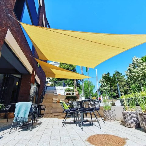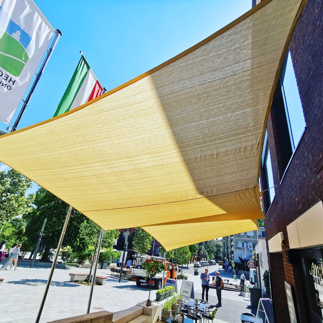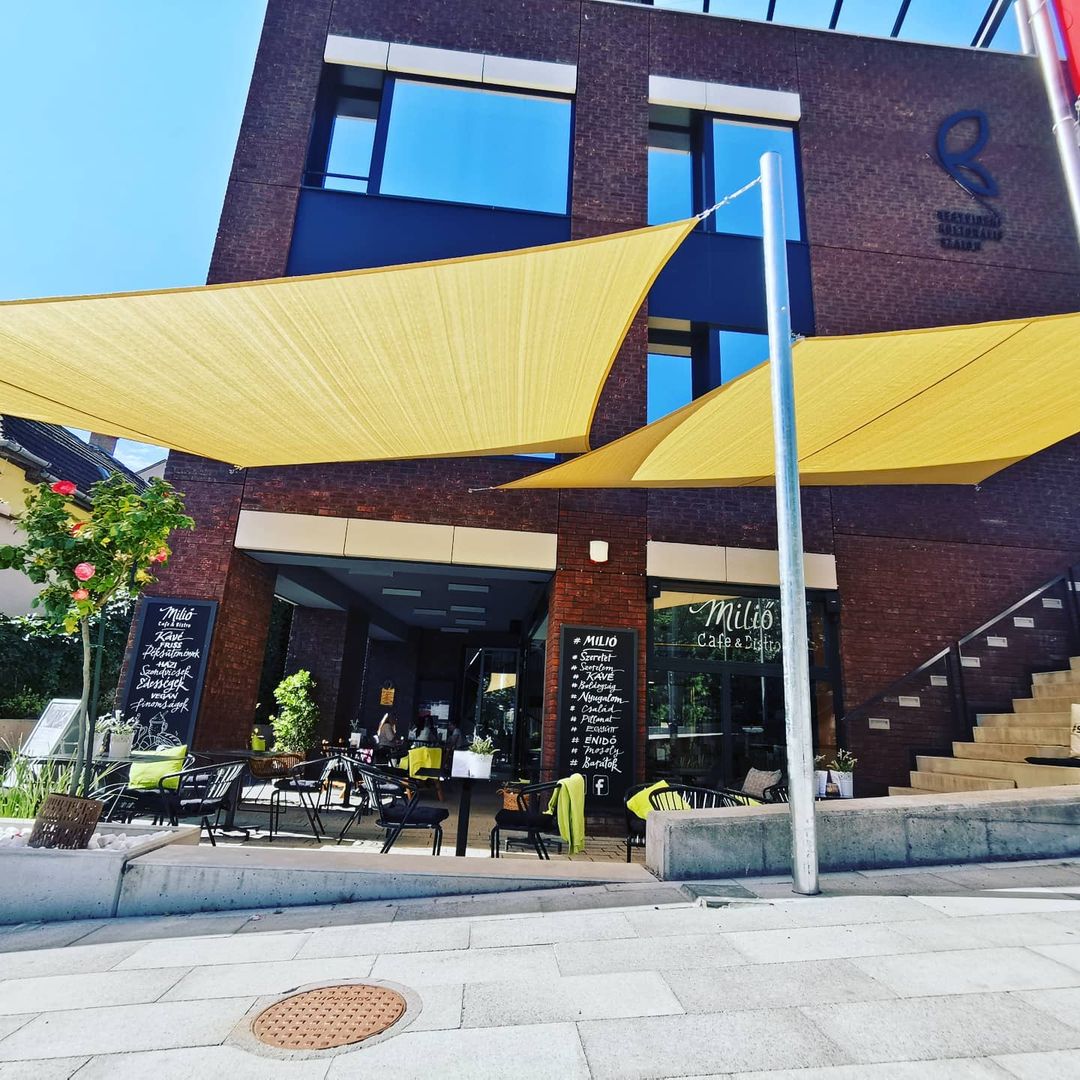 Árnyékolás napvitorlával Budapest XII. kerület Városháza előtti téren található kávézó teraszán.