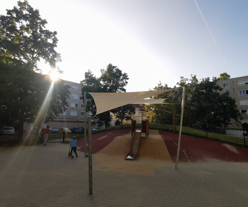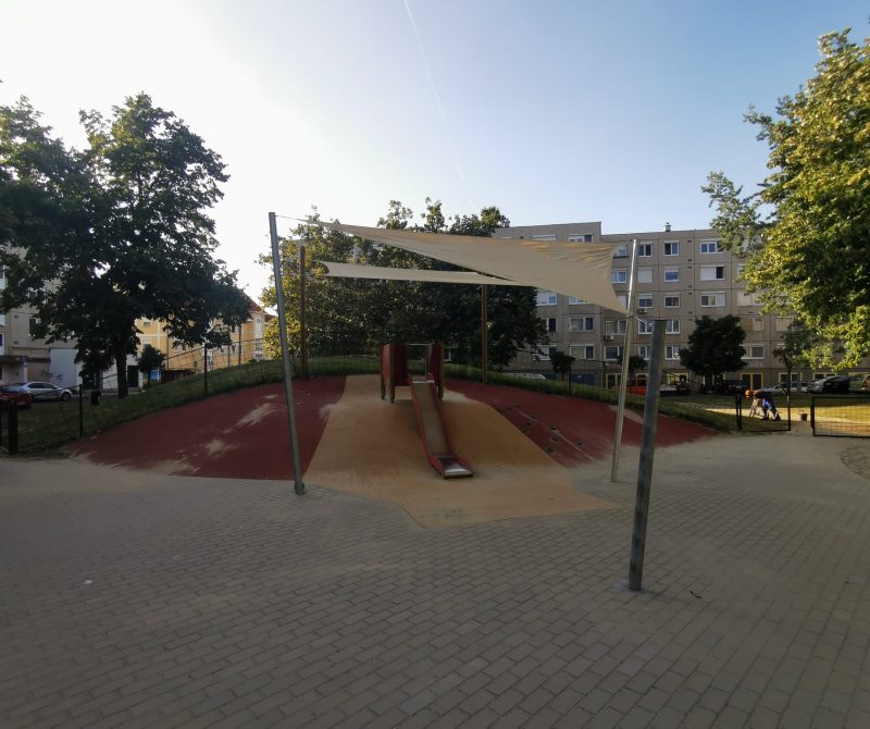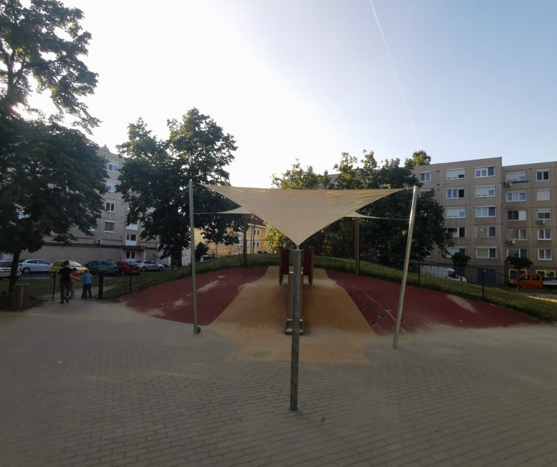 Tatabányai játszótéren található csúszda árnyékolása napvitorlával. www.napvitorlabudapest.hu ...