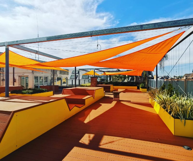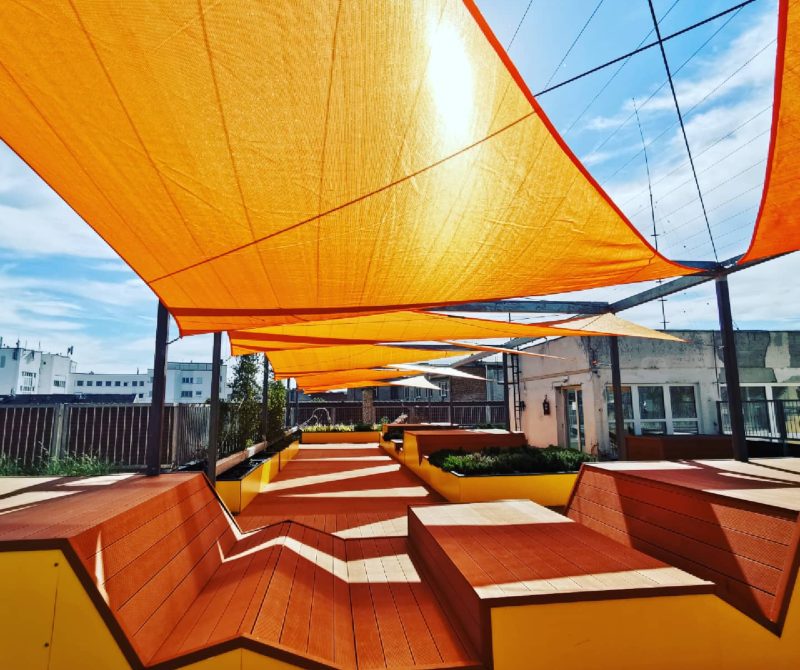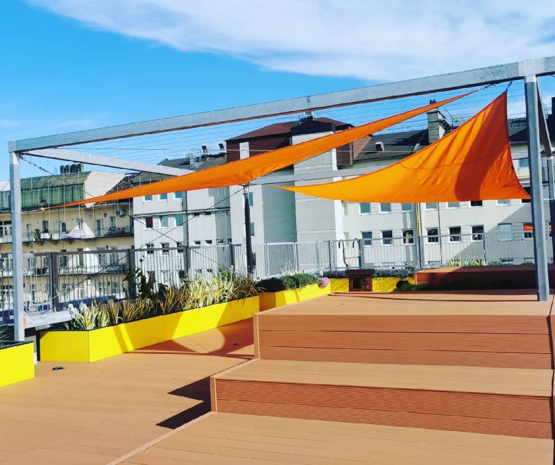 ELTE Bölcsészkar emeleti terasz. Gondolnak a diákokra. Árnyékolás napvitorlával. www.napvitorlabudapest.hu...