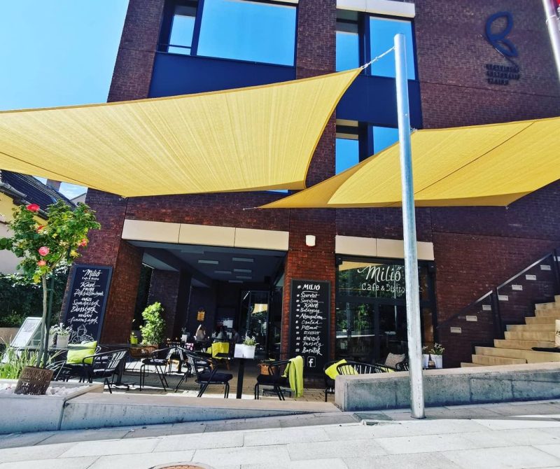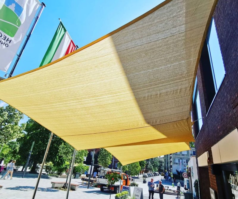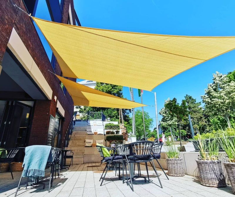 Árnyékolás napvitorlával Budapest XII. kerület Városháza előtti téren található kávézó teraszán. www.napvitorlabudapest.hu ...