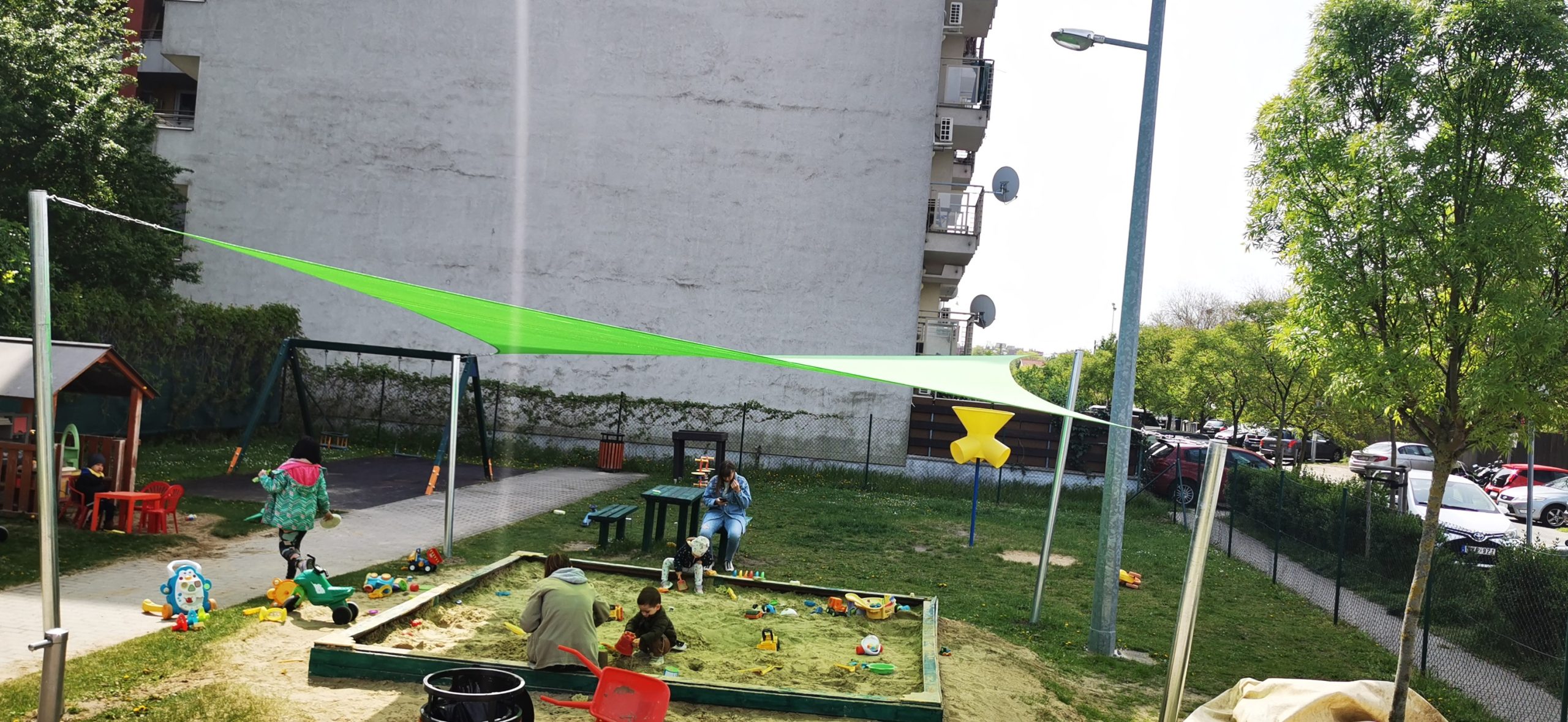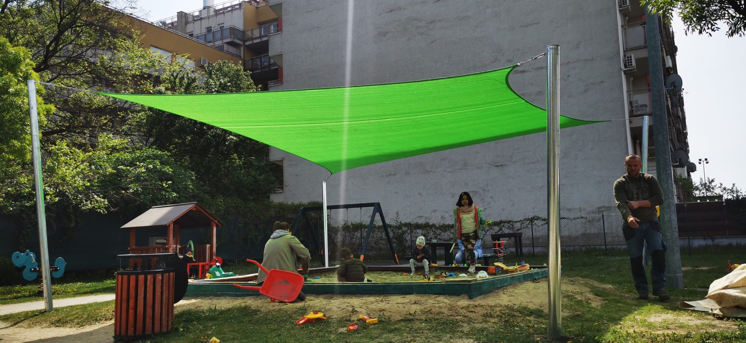 Homokozó árnyékolás napvitorlával, Budapest VIII. ker. Tisztes utcai játszótéren.