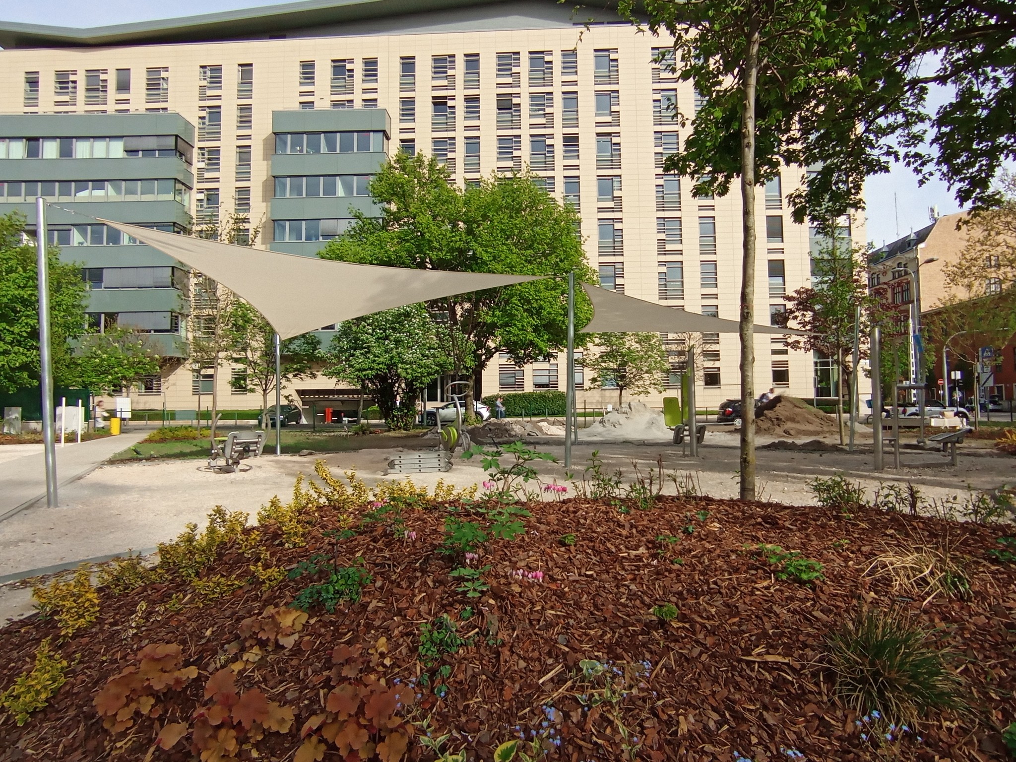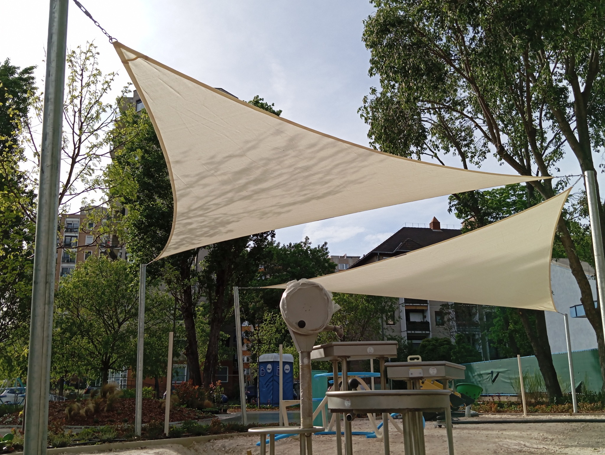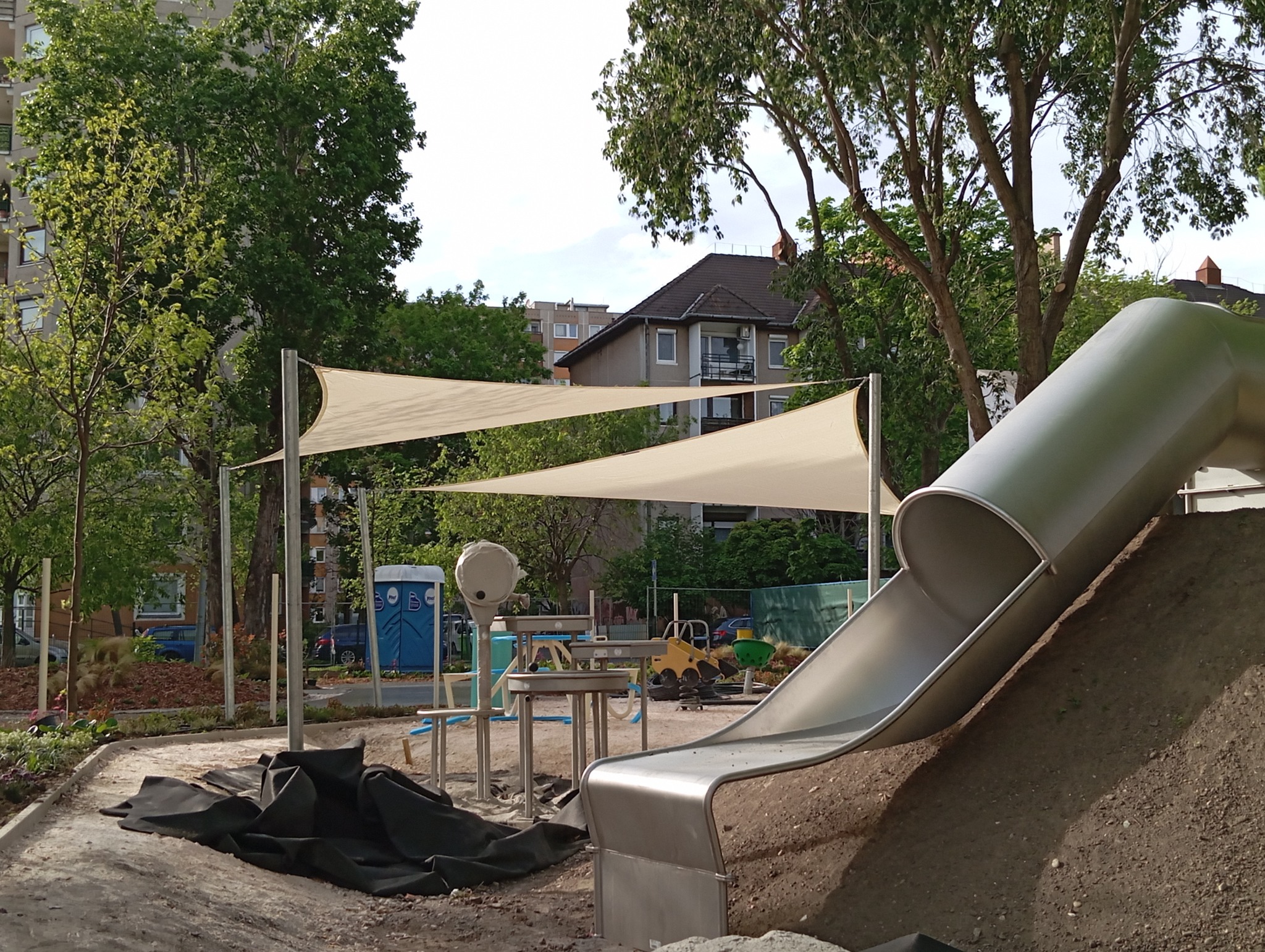 Budapest XIII. kerület megújult Dráva parkban, lassan nyit a játszótér. Játékok, fittness eszközök árnyékolása napvitorlával.